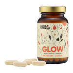 GLOW to suplement opracowany, by wspierać zdrowie skóry, włosów i paznokci od wewnątrz. Zawiera kolagen morski, witaminy C i E, biotynę, cynk, selen, kwas hialuronowy i ekstrakt z pestek winogron (OPC). Witamina C wspiera naturalną produkcję kolagenu, witamina E i OPC chronią przed stresem oksydacyjnym, a biotyna i selen dbają o kondycję włosów i paznokci. To produkt dla osób zmatowioną skórą, osłabionymi włosami i paznokciami lub narażonych na stres oksydacyjny.